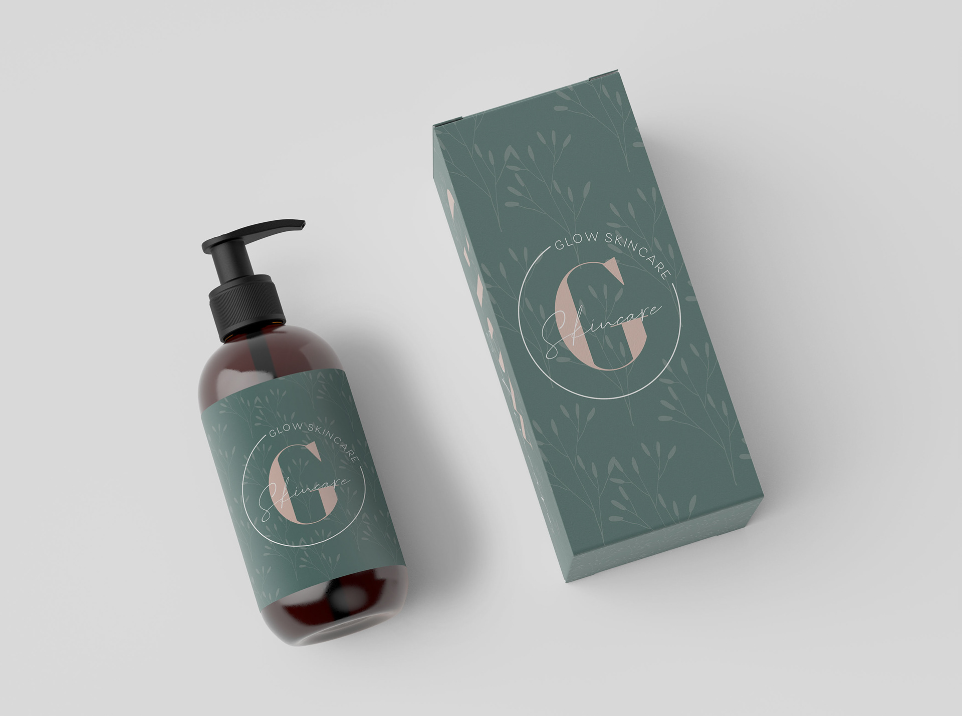 A skincare branding project, using a natural colour palette with a repeat floral pattern used in the logo and packaging.