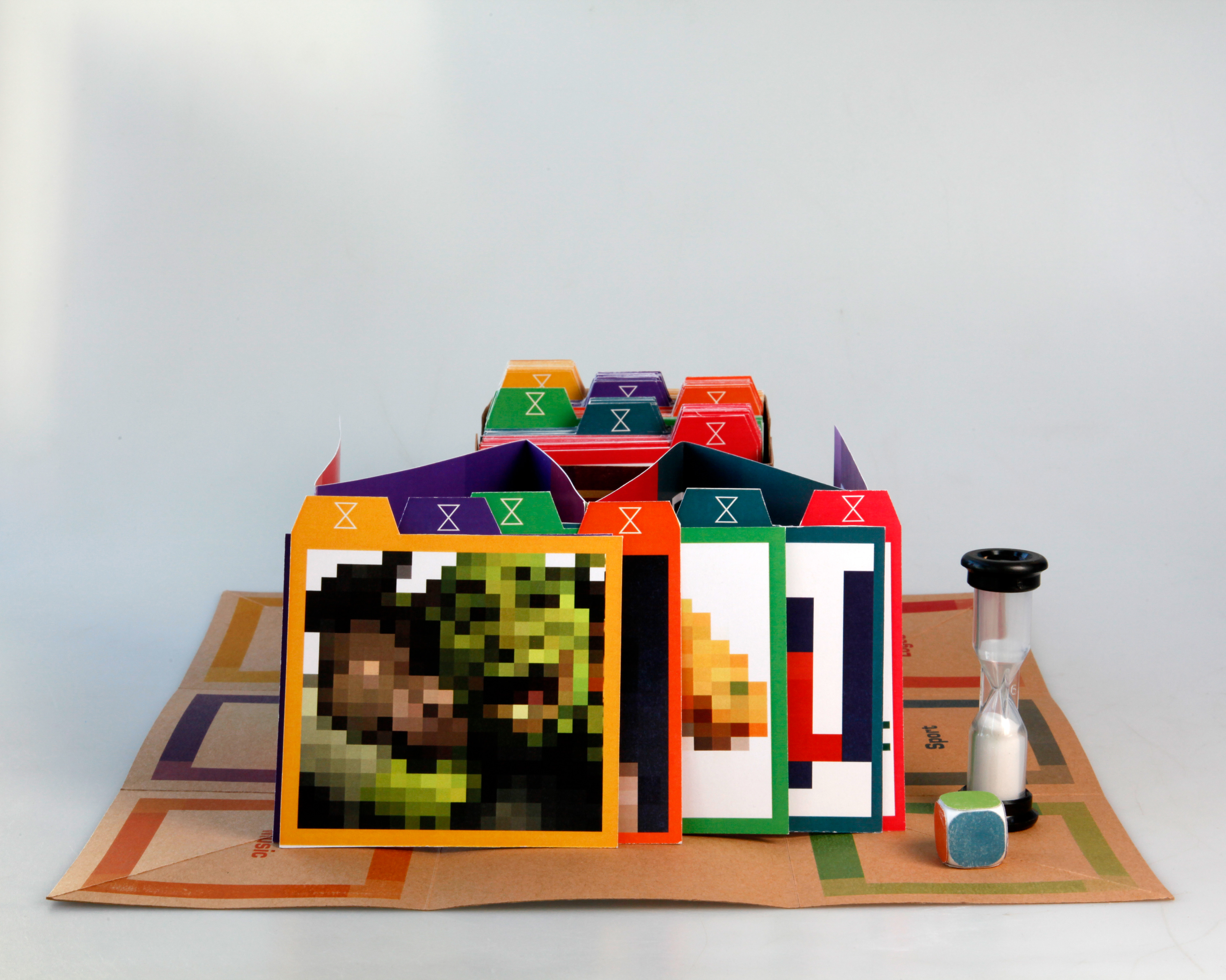 The name of the product was inspired by the concept of the game and within the logo a timer has been used to represent the letter 'x' and has become the icon throughout the game. The packaging design represents the idea behind the pixelated square which folds out into the board game. Inside the packaging holds the cards, timer, dice and instructions explaining how to play the game. The typeface that has been used throughout the design is EuroStile, the reason as to why this has been chosen is due to it being geometric and linking to the pixelated style. A promo video has also been made to show what is inside of the packaging and explaining the rules.
